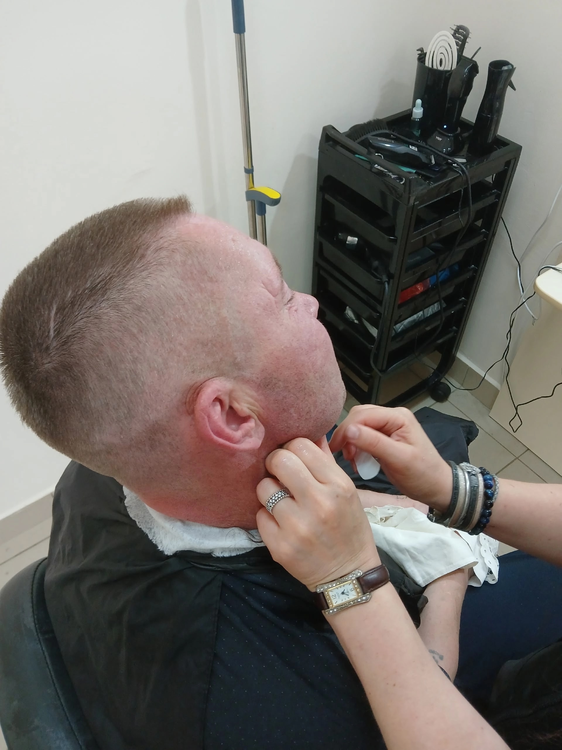 Сел в кресло и попросил аккуратно постичь покороче, объяснив ситуацию. Разглядываю раны, шишки, гематомы на лице и голове. Аккуратно бережно постигла, но оставлять открытыми раны совесть не позволила. Обработала зеленкой.